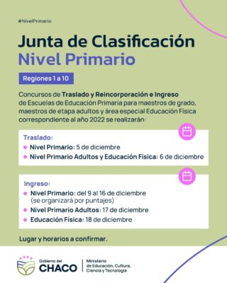El Ministerio de Educación, a través de las Juntas de Clasificación Nivel Primario, Regiones 1 a 10, informa a la docencia que los Concursos de Traslado y Reincorporación e Ingreso de Escuelas de Educación Primaria para maestros de grado, maestros de etapa adultos y área especial Educación Física correspondientes al año 2022 ya tienen fechas confirmadas: