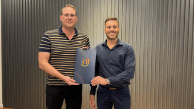 El presidente de Lotería Chaqueña Lucas Apud Masín junto al titular del Club Social de Las Breñas Sebastian Pertile, acordaron una importante obra para la entidad deportiva que este año cumplió su centenario.